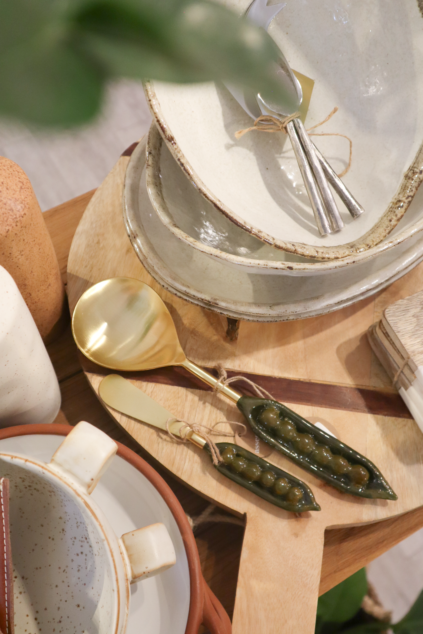 Stainless steel serving spoon with a fun peas in a pod enamel handle.