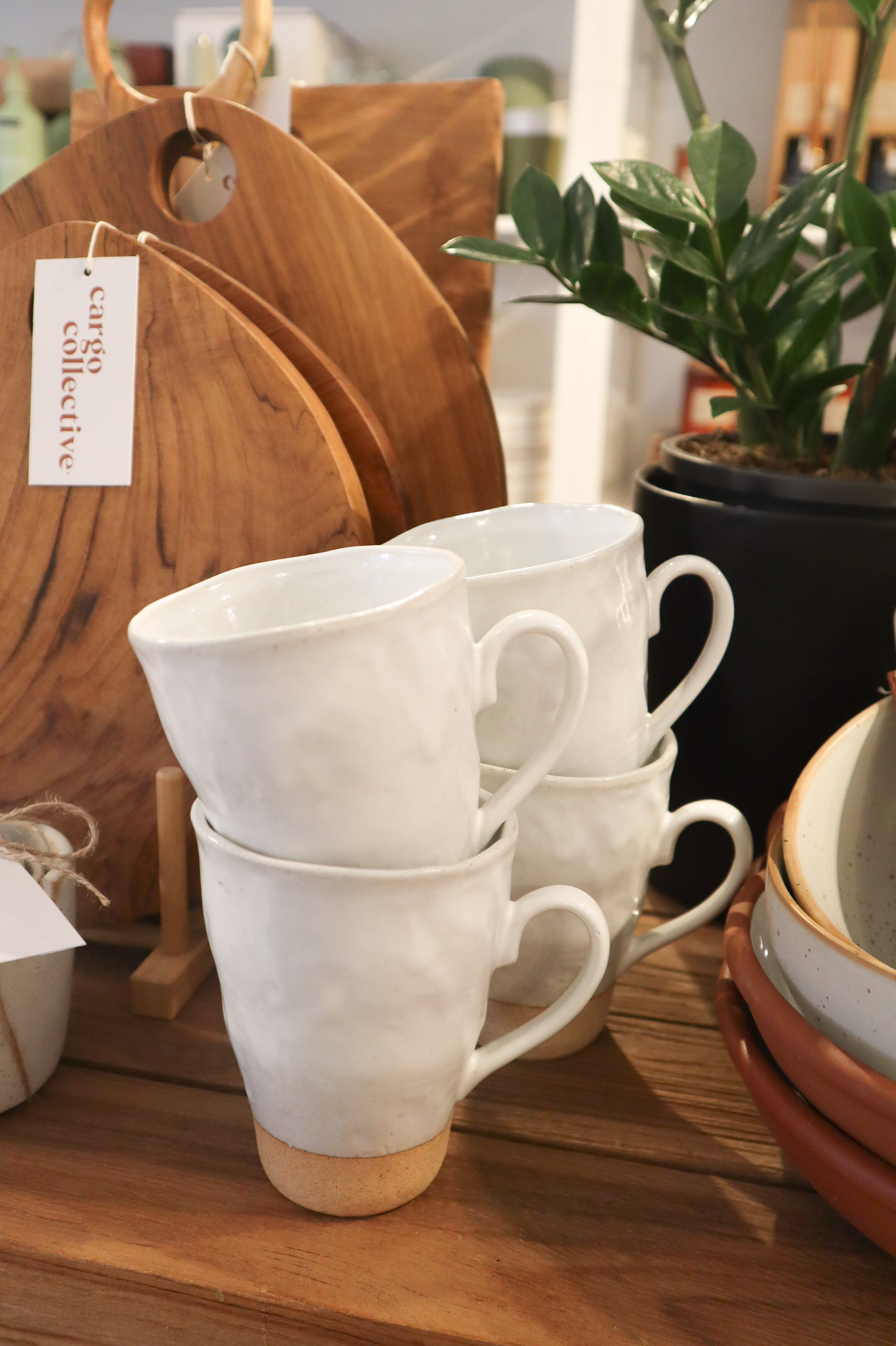 An organic shaped mug featuring a natural white glaze with an earthenware base.8.7cm diameter11cm height300ml capacityMade of minoyaki earthenware from Gifu prefecture, Japan.